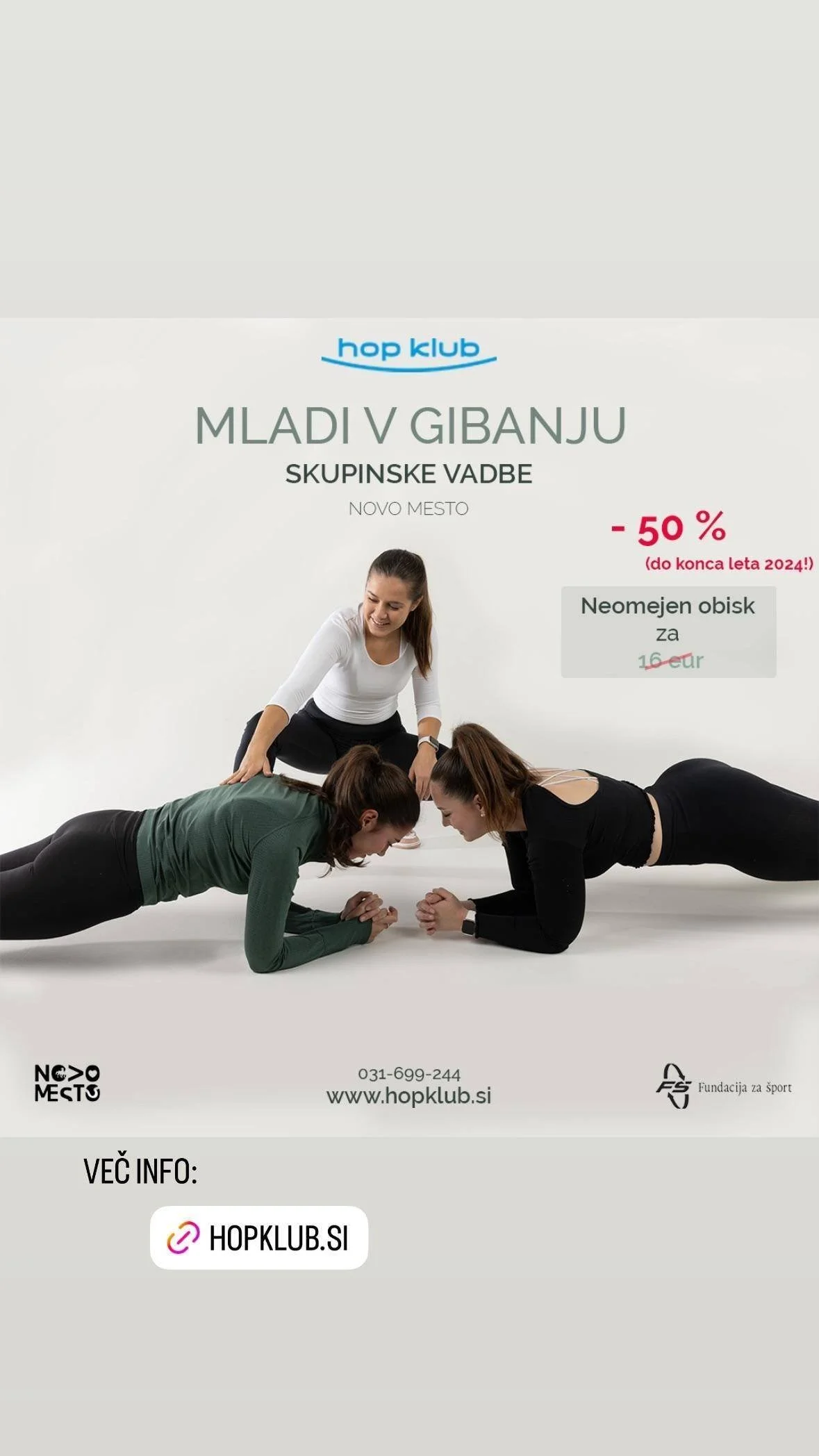 Člani Trim kluba se namesto plačila podpišete na seznam obiskov! Obvezna je potrjena otroška vadbena izkaznica Trim kluba, kjer je naveden izvajalec vadbe HOP KLUB.
